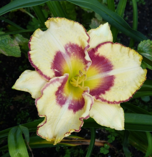 kwiat 15 cm, podobno pachnie i powtarza kwitnienie, kolor kości słoniowej z czerwonym okiem i podwójnym czerwono złotym brzegiem petali i z zieloną gardzielą.