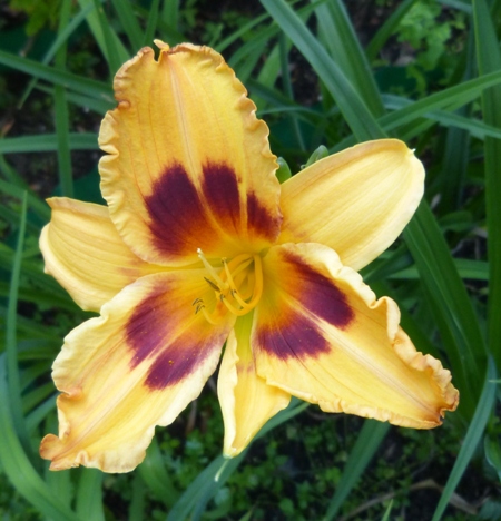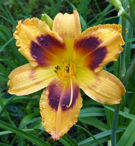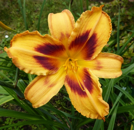 kwiat 14 cm, pomarańczowo żółty z szerokim czerwonym okiem i zielonkawo żółtą gardzielą, może powtarzać kwitnienie