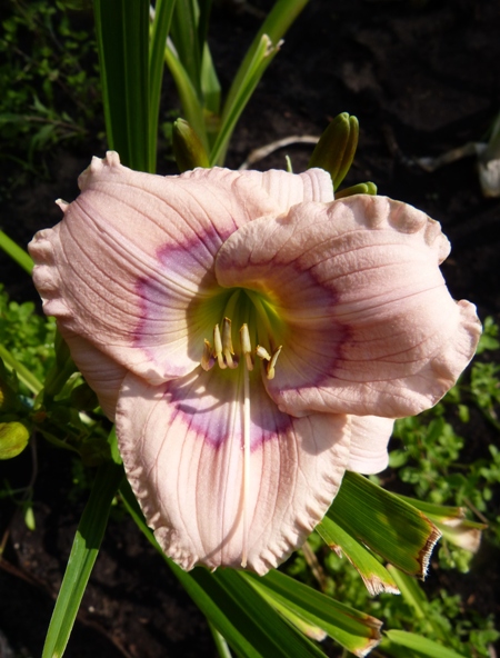 kwiat 9 cm, kolor orchidei z ciemno różowym (wpadającym w bordo?) narysowanym ołówkiem okiem i zieloną gardzielą (w oryginale "Orchid with cerise pencil eyezone and green throat".