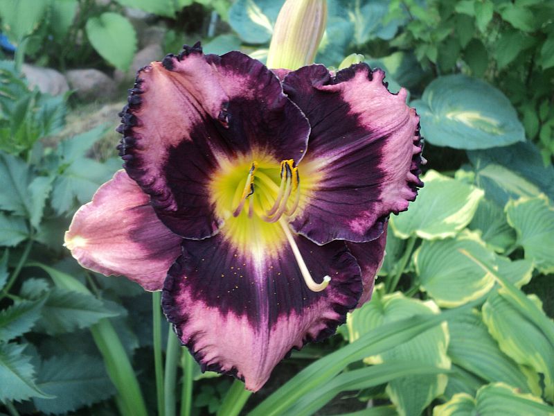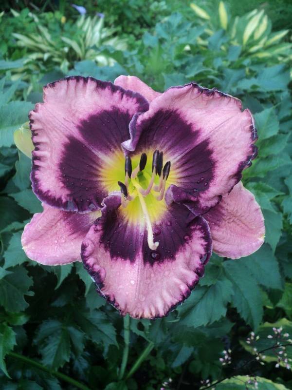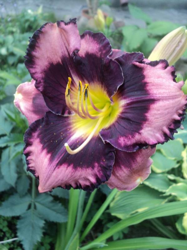 Kwiaty: kwiaty różowe z szerokim fioletowym okiem i obramowaniem płatków , gardło zielone.pofałdowane zewnętrzne krawędzie petali .Rysunek środkowej części okwiatu przeniesiony na sepale. Wielkość kwiatu ok 15 cm.