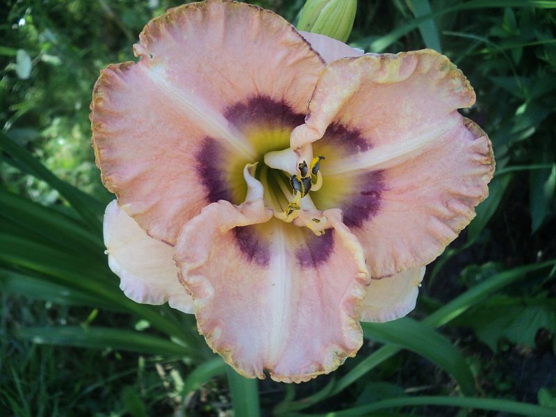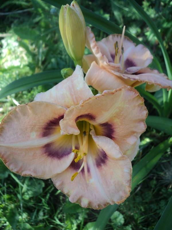 Kwiaty: kwiaty w kolorze cilistego róźu z odcieniem brzoskwiniowym ,dwubarwne oko przechodzące z fioletu w rozmyty lila róż w kierunku żółtej gardzieli. Petale szerokie, przekreślone jaśniejszymi wstęgami, obramowane delikatną falbanką zakończoną wąskim, fioletowo złotym obrysem. Wielkość kwiatu ok 13 cm.