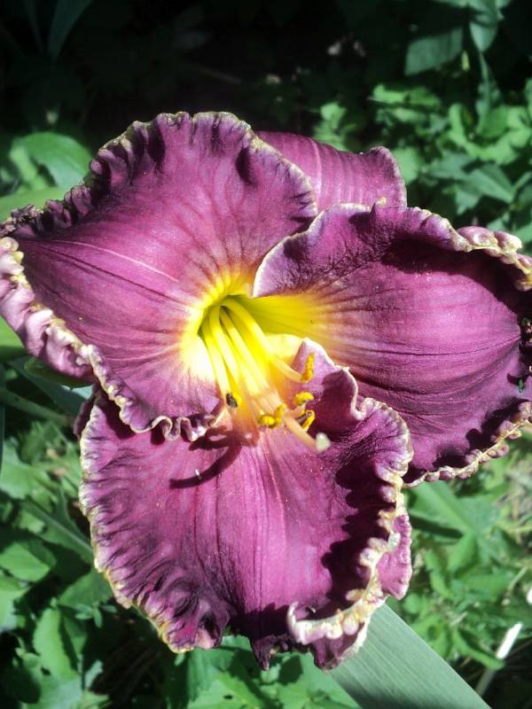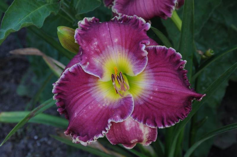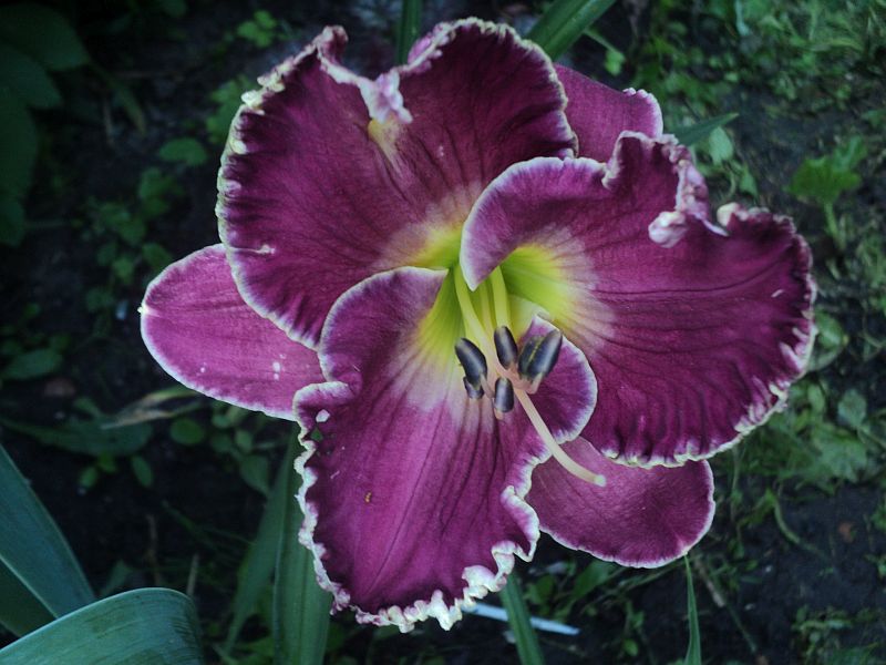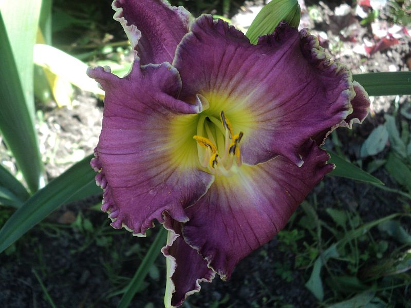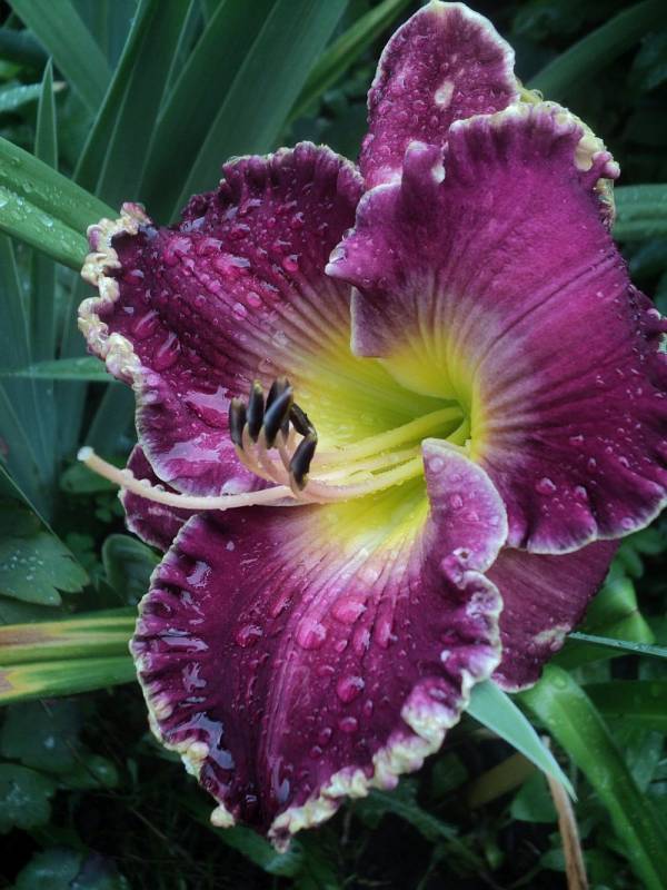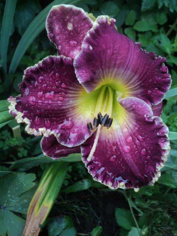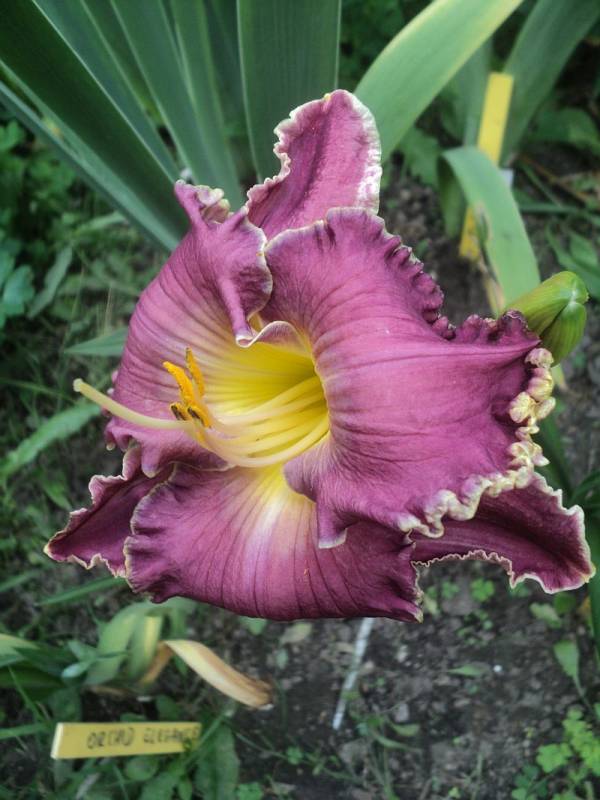 Hodowca: Agin 2005 Wysokość: ok 65 cm Kwiaty: kwiaty w kolorze czerwieni burgundzkiej z niebiesko purpurowym okiem .Na obwodzie płatków wyraźna biała falbanka . Gardziel zielona .Wielkość kwiatu ok 15 cm. Stanowisko: słoneczne do półcienistego. Mrozoodporność: zimuje bez okrycia .