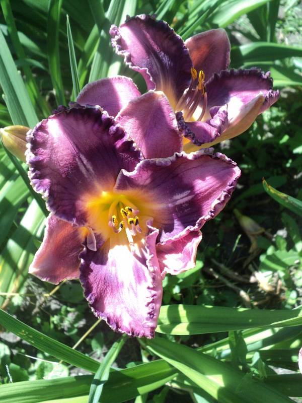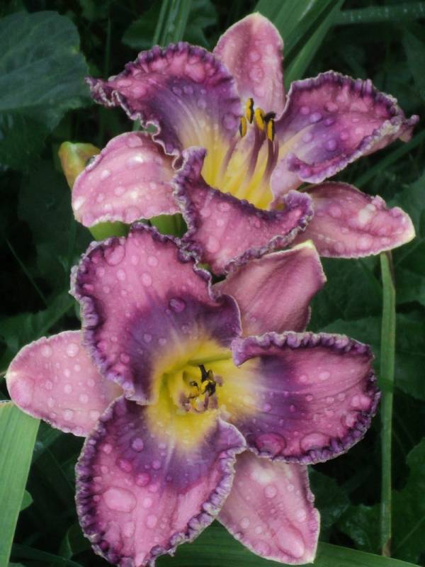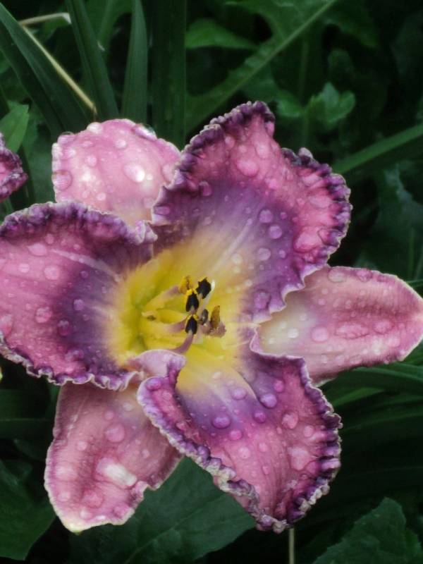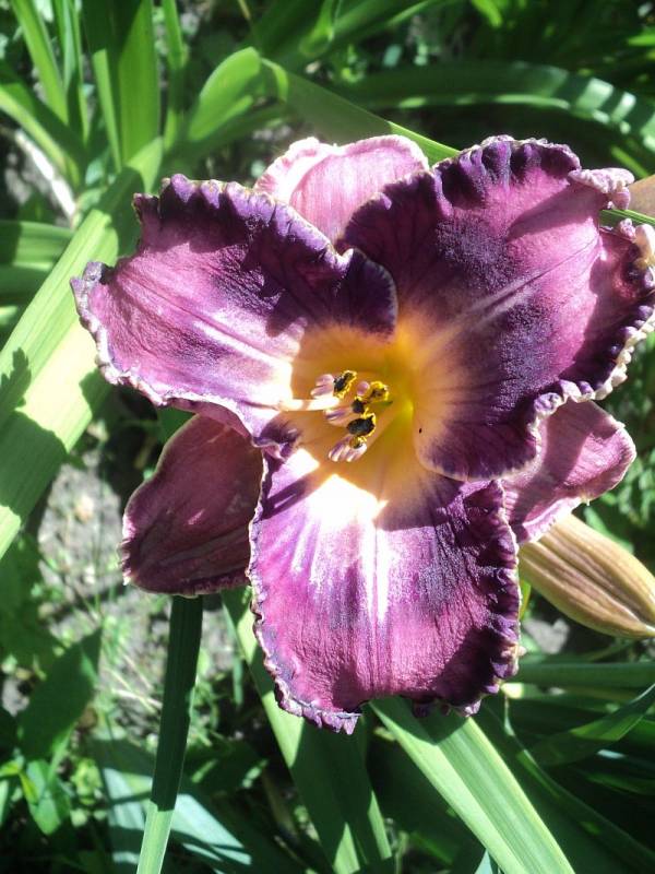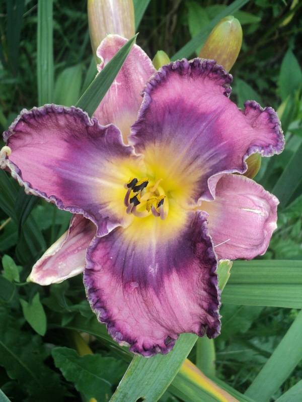 Kwiaty: kwiaty w kolorze fiołkowo-różowym , z fioletowym ,cieniowanym okiem i platynowo -fioletową falbanką na brzegach płatków , gardło żółto-zielone. . Wielkość kwiatu ok 11 cm.