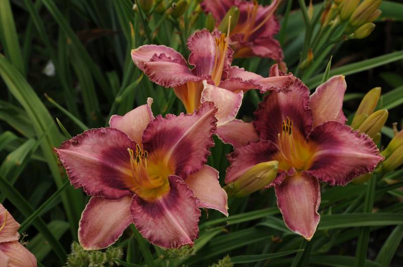 Hodowca: Brooker, 2002 Wysokość: 70-80 cm Kwiat: spory, o średnicy 15-17 cm, fioletowo-różowy z purpurowym okiem i żółto-zieloną gardzielą. Mocno zaznaczona falbanka wykończona srebrnym brzegiem. Termin kwitnienia: czerwiec, lipiec, może powtarzać