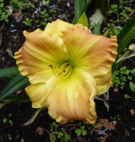 kwiat 14 cm, żółty z brązowym nałożeniem (?) (bronze overlay) i zieloną gardzielą.