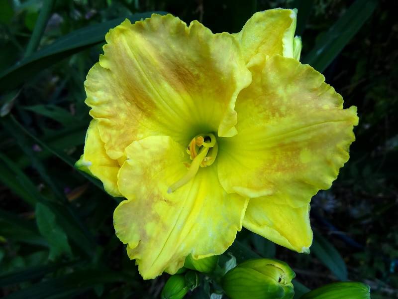 kwiat 15 cm, złoty "przeczesany" zmieszany (?) brązem z ogromną lemonkowo żółtą gardzielą, podobno pachnie