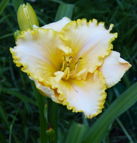 kwiat 14 cm, kremowo żółty z różową nakładką (?) (overlay) i jaskrawą żółtą gardzielą, podobno pachnie