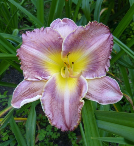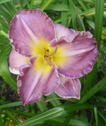kwiat 14 cm, burgundowo fiopletowy z burgundowym okiem, złotym brzegiem i zieloną gardzielą, może powtarzać kwitnienie
