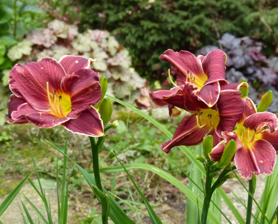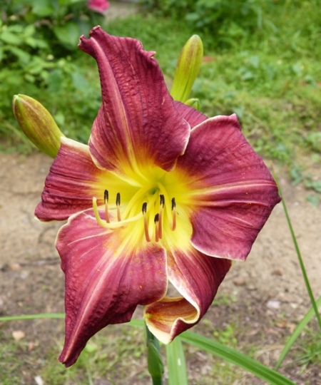 kwiat 12 cm, ciemno czerwony z filetowym cieniem i ciemniejszymi żyłkami z białą lamówką i zieloną gardzielą, może powtarzać kwitnienie