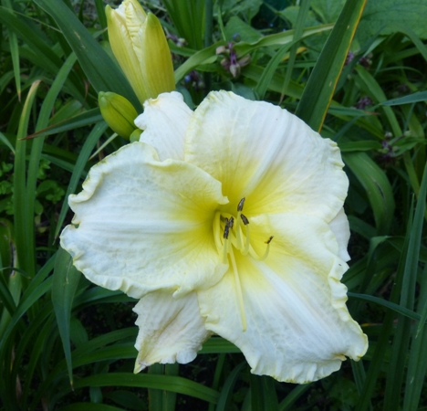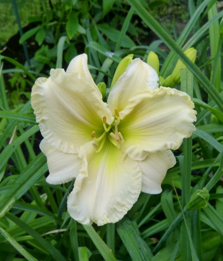 kwiat 14 cm, prawie biały z zieloną gardzielą, może powtarzać kwitnienie, podobno pachnie