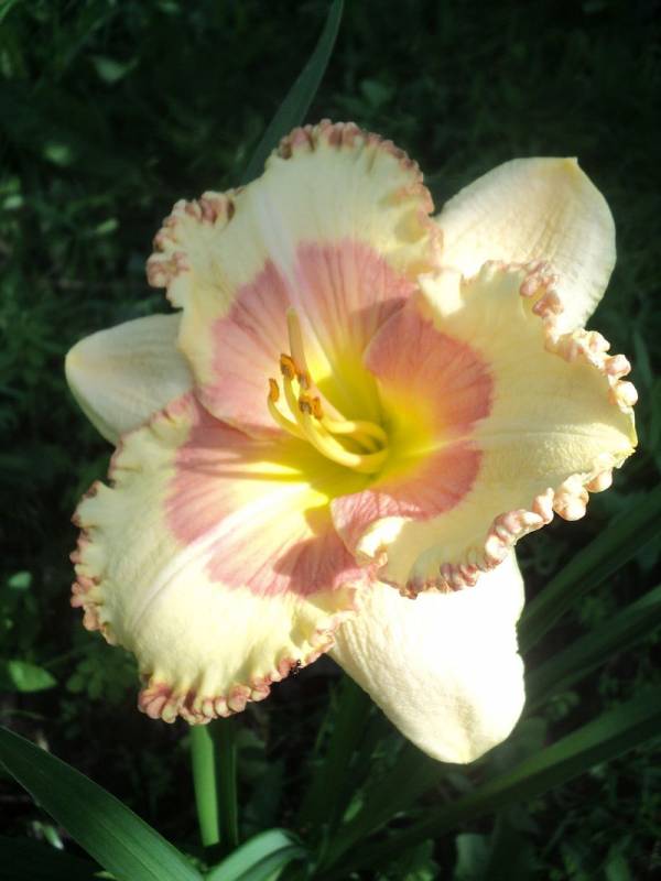 Hodowca: S. Achramowicz, 2014 Wysokość: ok 75 cm Kwiaty: kwiaty kremoworóżowe z jasnoróżowym okiem , płatki wykończone falbanką w kolorze oka , gardło kremowozielone. Wielkość kwiatu ok 14 cm. Stanowisko: słoneczne do półcienistego. Mrozoodporność: zimuje bez okrycia. Uwagi : 4 rozgałęzienia i do 23 pąków - u mnie pierwszy rok , więc ta informacja będzie do weryfikacji