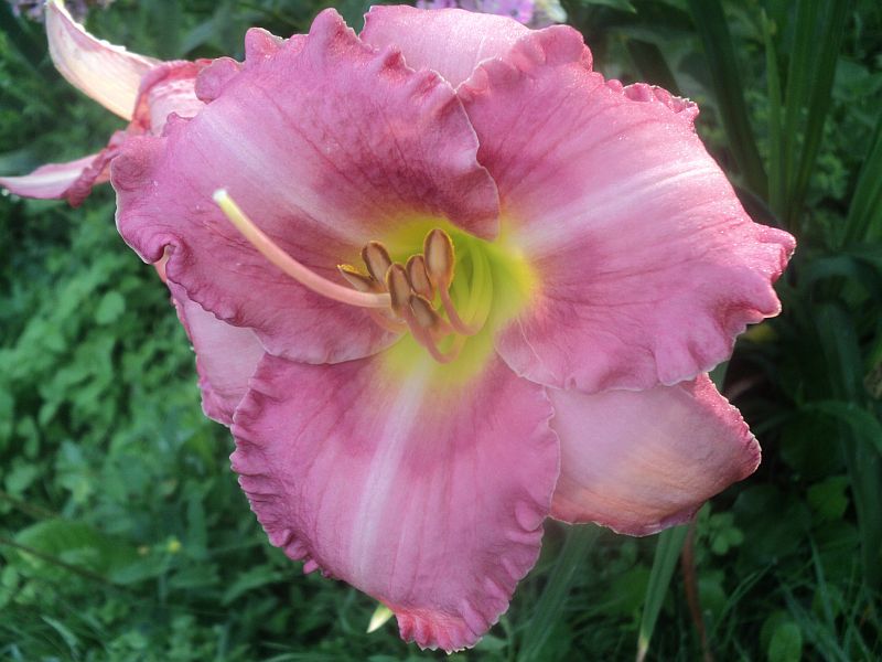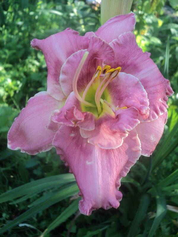 Hodowca: S. Achramowicz, 2017 Wysokość: ok 110 cm Kwiaty: kwiaty koloru pastelowo różowego z odcieniem czerwieni z wąskim o odcień ciemniejszym , rozmytym okiem , płatki wykończone falbanką , gardło kremowozielone. Wielkość kwiatu ok 14 cm. Stanowisko: słoneczne do półcienistego. Mrozoodporność: zimuje bez okrycia. Uwagi : z informacji hodowcy wytwarza 3 – 4 groniastych rozgałęzień i około 30 pąków - u mnie pierwszy rok , więc ta informacja będzie do weryfikacji . To jego pierwsze kwitnienie , zdarzały się kwiaty półpełne , zobaczymy jak będzie zachowywał się w nastepnych sezonach. Zakwitł pod koniec sezonu . Kwiaty pachną.