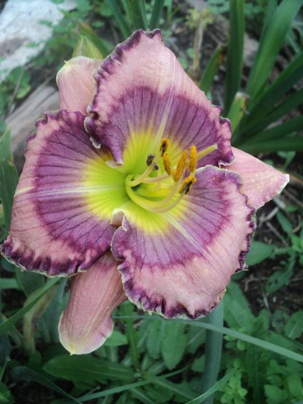 Hodowca: J.Bodalski 2016 Wysokość: ok 75 cm Kwiaty:Kwiaty jasno różowe z niebiesko lawendowym okiem i dwubarwną biało- lawendową falbanką , gardło zielono-żółte . Wielkość kwiatu ok 14 cm. Stanowisko: słoneczne do półcienistego. Mrozoodporność: zimuje bez okrycia. Uwagi : 2 rozgałęzienia,14 pąków na pędzie , w/g informacji hodowcy powtarza kwitnienie .