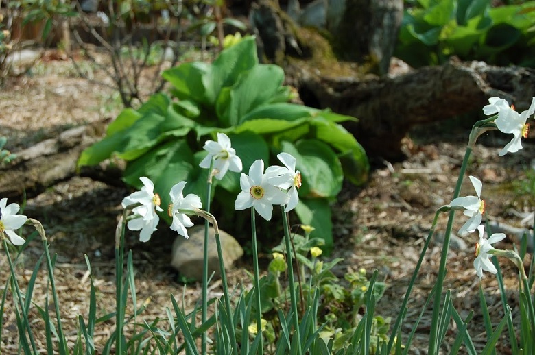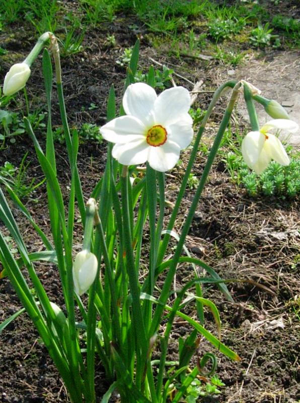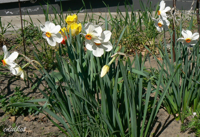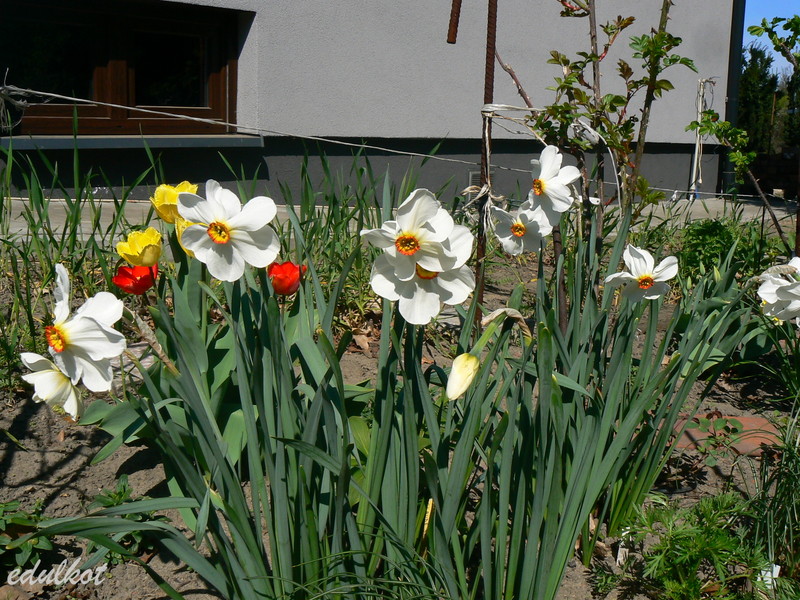 Tutaj są moje narcyzy poeticus. Mam zarówno Actea jak Recurvus. Tylko nie mogę za nic dojść, który jest który. Może mi pomożecie. Zasadniczo różnią się tylko terminem kwitnienia, troszkę zapachem i podobno nieco wielkością kwiatu.
