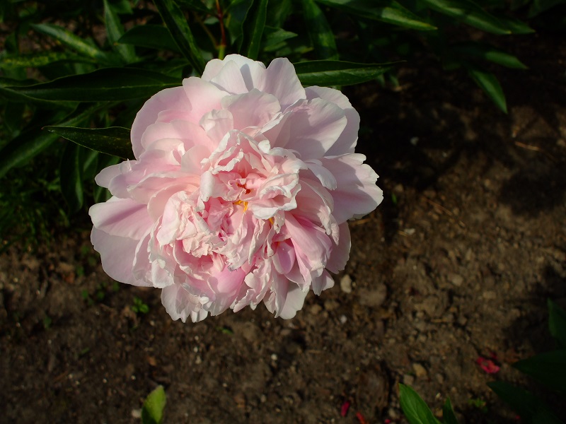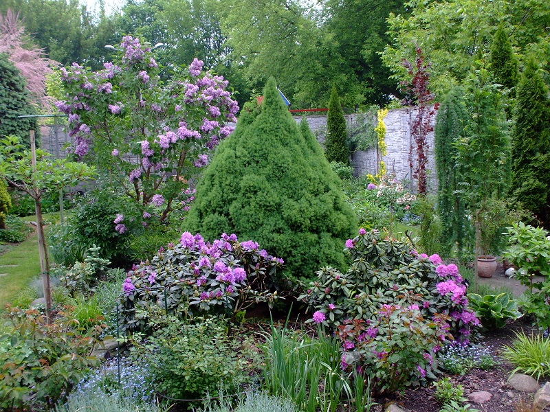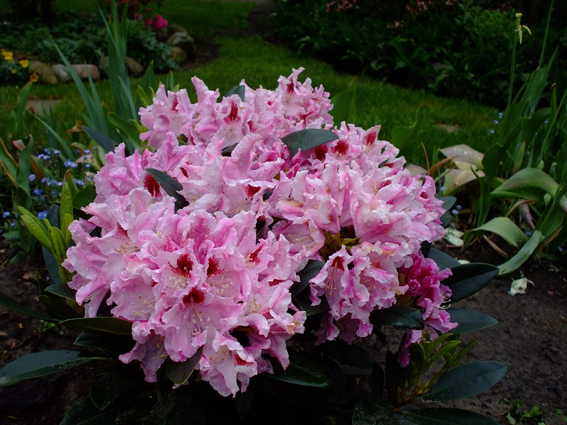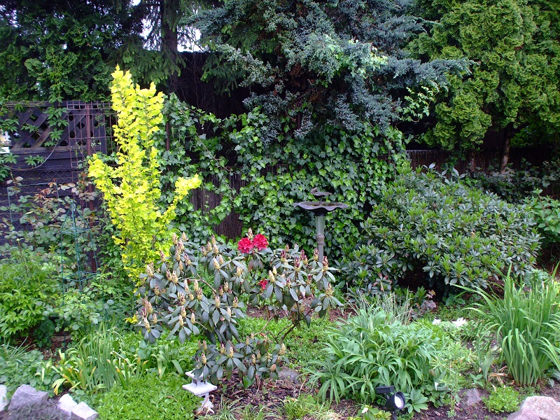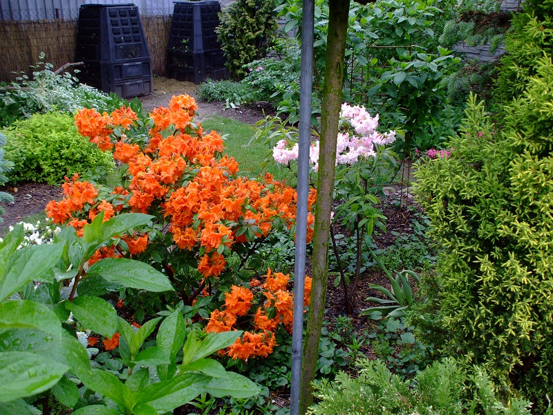 rododendrony zaczynają zakwitać, niektóre pojedynczymi kwiatami. Te dwa, co roku tak dziwnie zakwitają połową krzaczka, tą od słonecznej strony. Później zakwita druga strona.