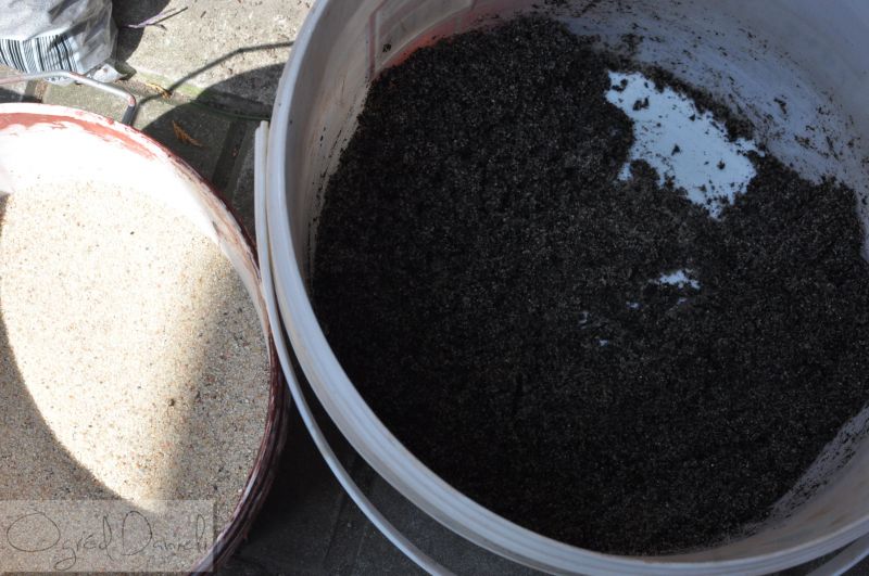 Potem przygotowałam mieszankę do sadzenia roślin z ziemi ogrodowej i żwirku (może być budowlany) - mieszanka 1:1, ewentualnie więcej żwirku. Masa była specjalnie przygotowana jako wilgotna, bo lepiej się "lepi" do skał