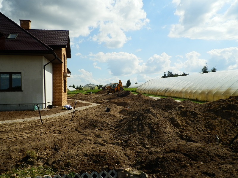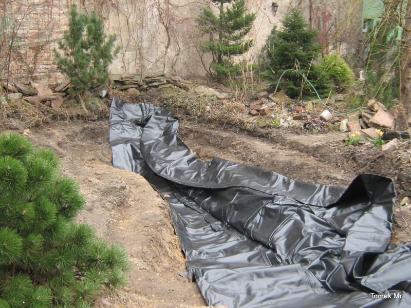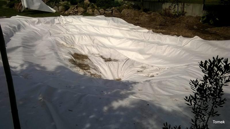 Gotowy wykop należy oczyścić z kamieni, korzeni i innych ostrych przedmiotów a następnie można lekko podsypać przesianym piaskiem lub wyłożyć włókniną lub flizeliną jak na zdjęciu poniżej.