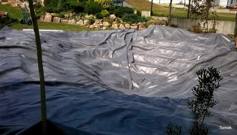 Rozkładamy luźno folię i powoli nalewamy wodę. Staramy się aby folia miała jak najmniej załamań.