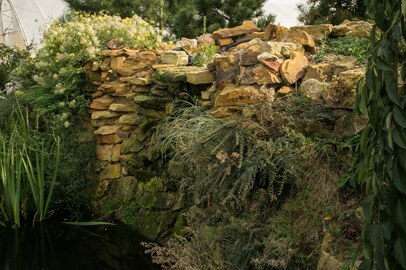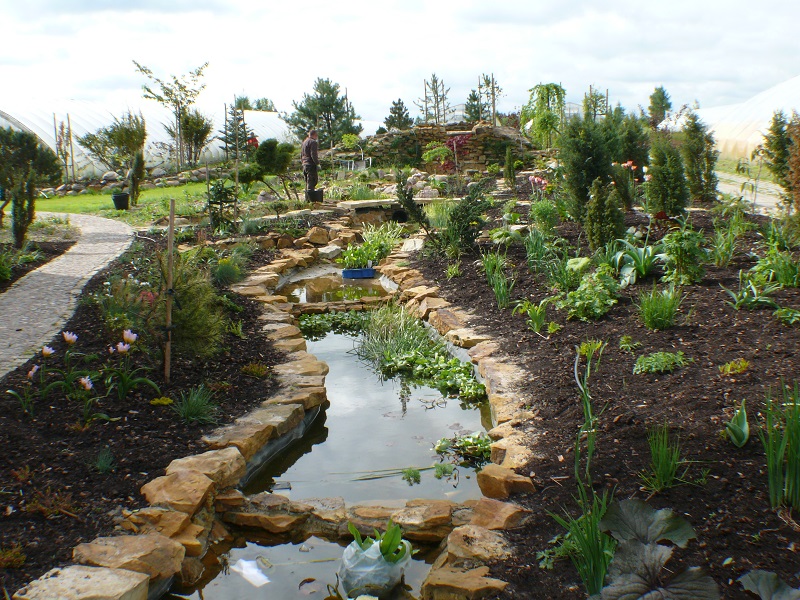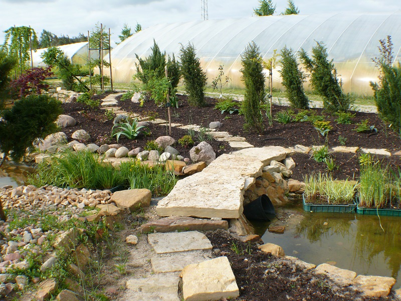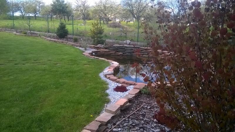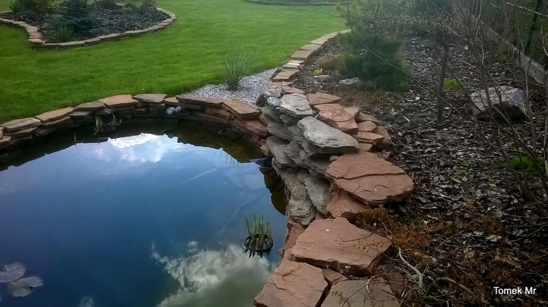 Tu brzegi oczka zostały wyłożone płaskimi blokami piaskowca.