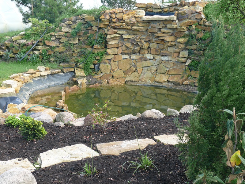 Wykop powinien mieć kilka półek. Pierwsza zwykle służy jako bariera kapilarna i daje możliwość zamaskowania brzegów folii w tym wypadku kamieniami.
