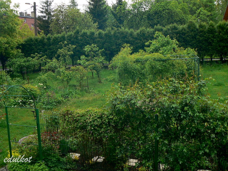 wychylając się i patrząc za wschód widzimy sosnę, basenową, łuki z różami i wielgaśny orzech włoski