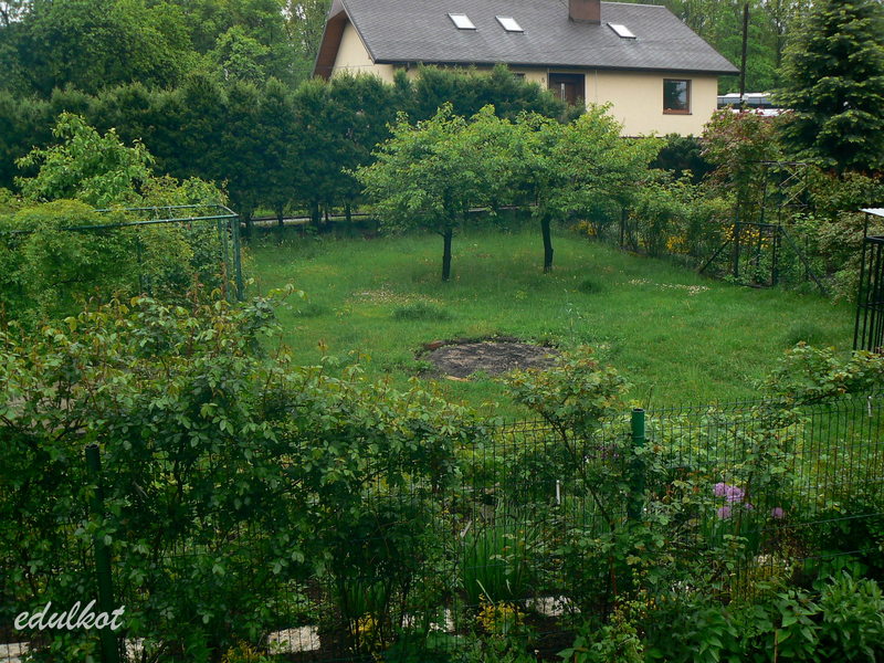 wychylając się jeszcze bardziej widać płotek i przyszłą różaną rabatę południową