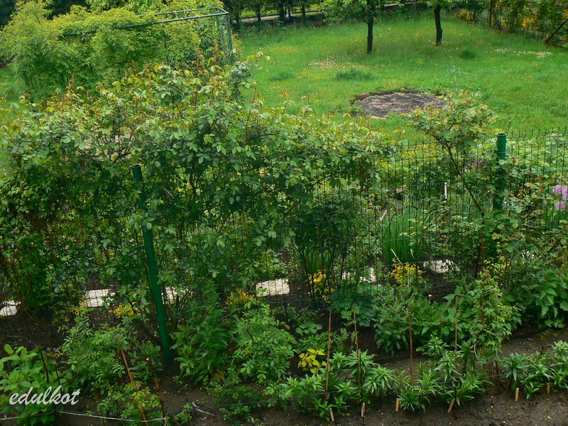 prawie na wprost w środku widać klatkę z pnącymi różami i powojnikami, a dołem płotek z takimi samymi nasadzeniami