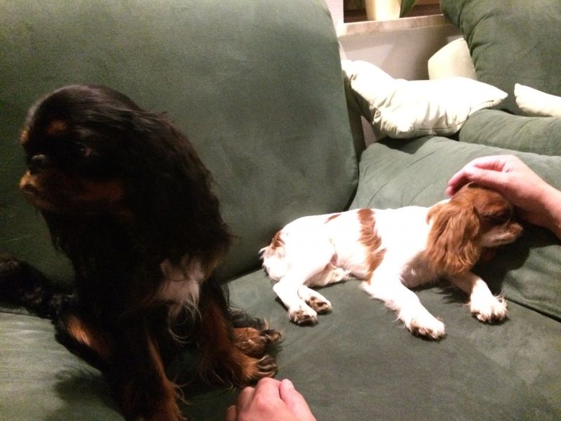 Generalnie nowego kumpla akceptuje, zerka czasem, podchodzi do niego merdając ogonkiem..ale generalnie niedobry z niego starszy brat. Warczy na maluszka, jak ten próbuje do mnie podejść.
