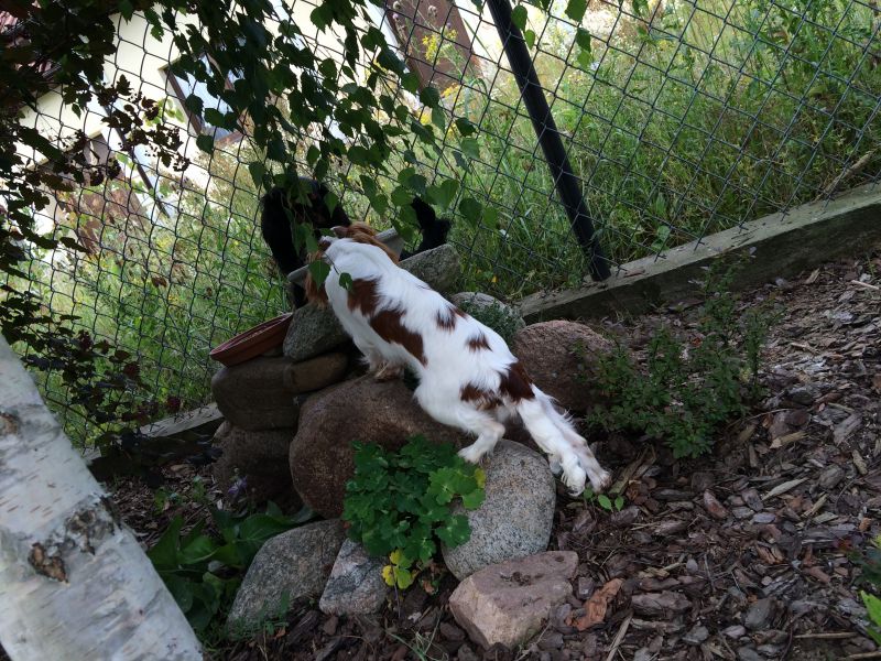Wspólne wychodzenie na ogródek jest ok- bez awantury przy drzwiach. Po ogródku też dobrze- Cyguś ma sporo pracy, więc nie ma czasu się zajmować intruzem.