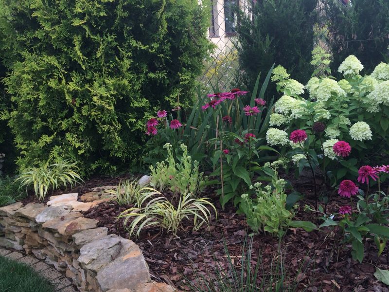 na razie dość skromnie- mam nadzieję, że jak jesienią podsypię kompostu trochę pod młode kępy jeżówek, to za rok nabiorą ciała i zrobi się kwitnąca gęstwina. Jeśli Phantom będzie zakwitać wcześniej, to też wszystko będzie lepiej wyglądać- 2 punkty z białymi kwiatami, a w ich nogach różowe jeżówki