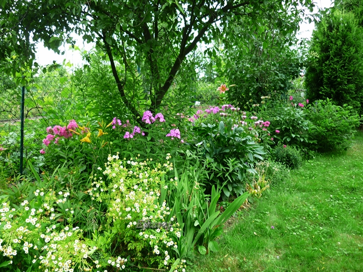 Maj - liliowce żółte, śniedki, irysy kłączowe fioletowe, kocimiętka fassena, zaczyna kwitnąć kuklik.