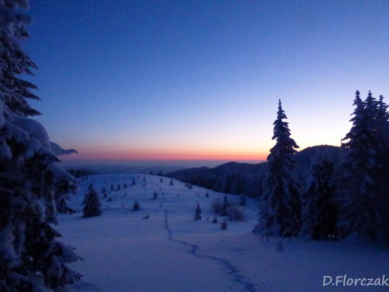 we czwartek rano pobudka przed 3 niebie wyjaśnione mróz -12 st i poszłam sprawdzić swoja kondycję przed EDK .O 3 wyruszyliśmy na szlak w dwóch samochodach kilkoro turystów się przebierało do wyprawy na Babią ,my wolnym ale stabilnym krokiem,ruszyliśmy na szlak,bylo zimno ale nie tak bardzo jak ostatnio.Trzech turystów minęlo nas szybkim krokiem,zastanawiałam się po co tak pędzą,natomiast małżeństwo młodsze od nas też nas wyprzedziło w takim tępie że pomyślałam hola,hola