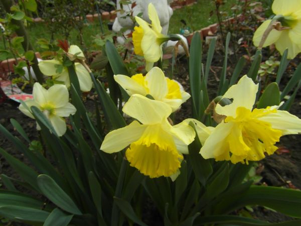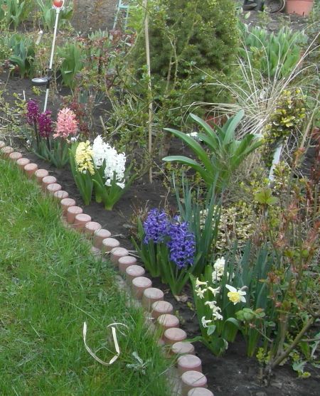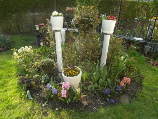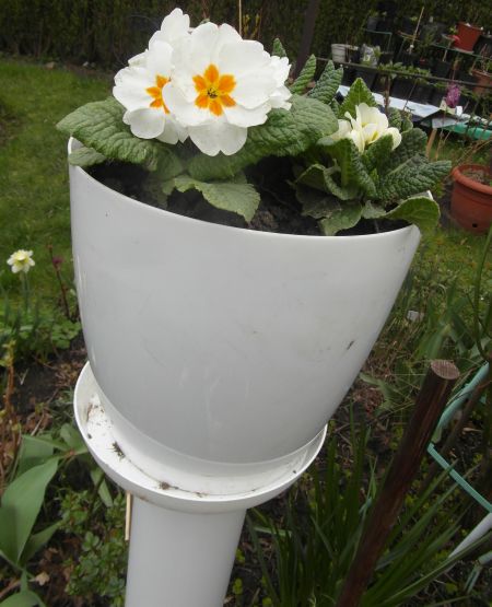 Zrobiłam te wysokie doniczki z myślą obsadzenia zwisającymi roślinami- posadzę dopiero w maju, bo na razie nie ma sadzonek tych na rynku. Pierwiosnki sa tylko tymczasowo... Pomysł przyszedł mi do głowy gdy byłam z mężęm w sklepie po rury i części do zbiornika wodnego- takie tam różne do założenia pompy. Na tych rurach wciśnięte nakładki- takie zaślepki do rur, a do nich przyśrubowałam podstawki- i na nie postawiłam doniczki. Rury wkopane, więc się nie ruszają... ;) Wewnątrz dodatkowo wbite kołki długie w ziemię- by to utrzymać mocno w pionie... think:
