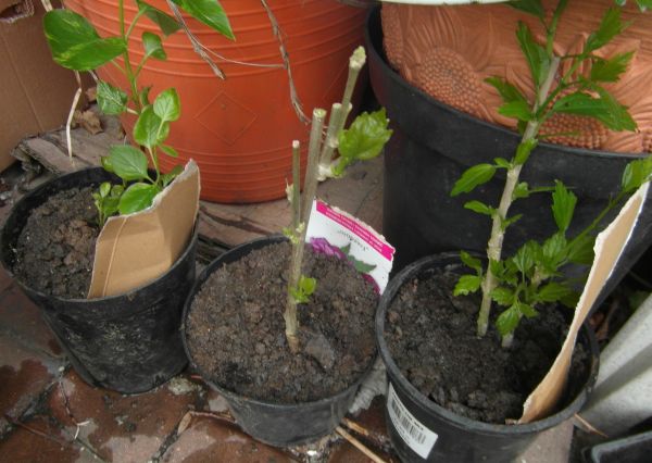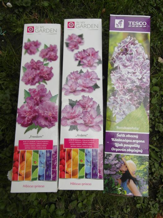 W sobotę- przy okazji zakupów spożywczych- zaniosło mnie w Tesco na dział ogrodniczy... wink-3 Zadziałał mój instynkt- oczywiście :wygrzebałam spośród kartoników- dwa z ketmiami i jeden lilak w ciapki dla synowej, / bo ja mam - z Biedronki/