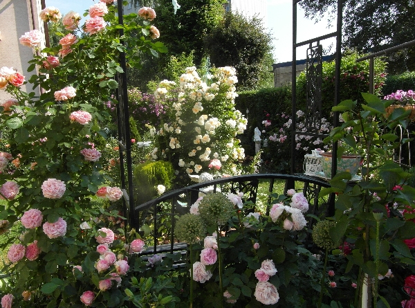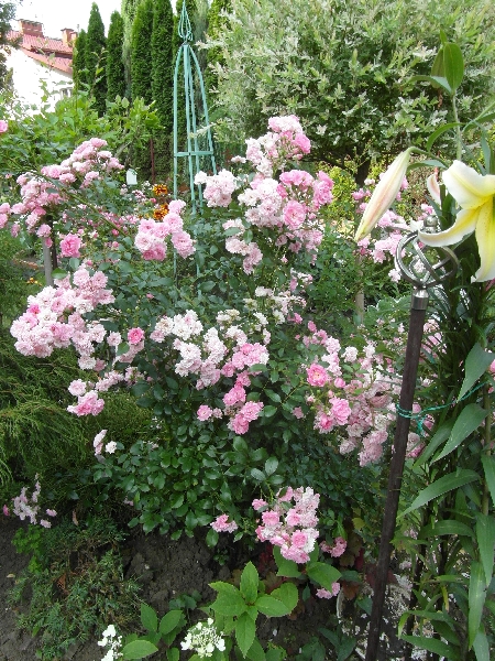 Mnie też się podoba to przenikanie- poniekąd musi być, bo małżonek jak lew broni trawnika, a ja mam zapędy stale na nowe róże- i z musu rosną blisko, by jak najwięcej zmieścić... A tyle jeszcze bym chciała mieć... :)