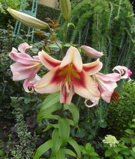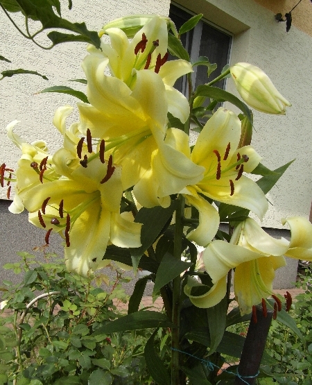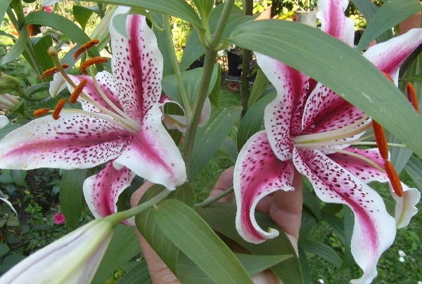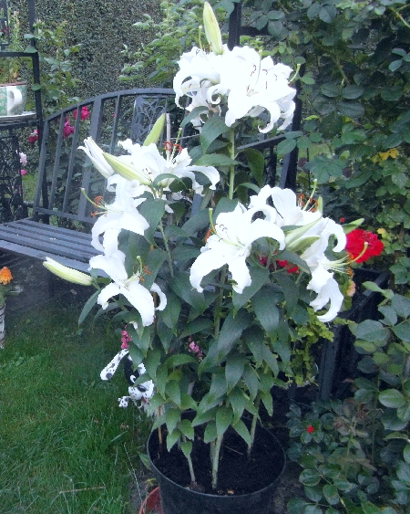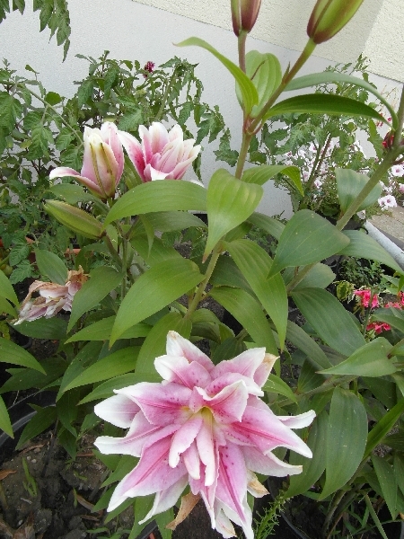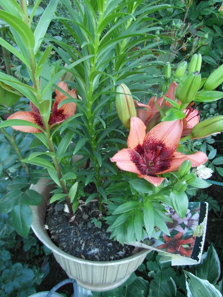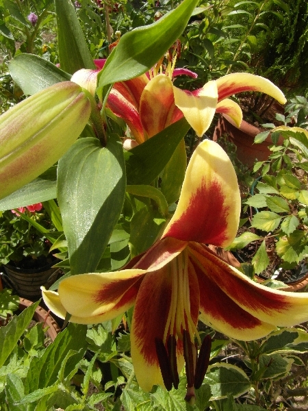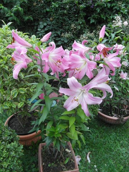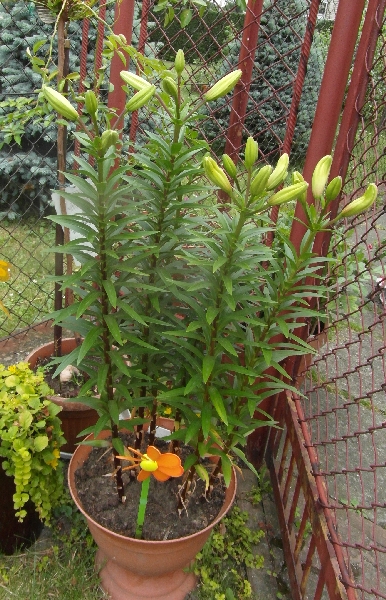 Może te fotki lepiej odpowiedza niz ja opisowo... Nie dołuje lilii/ chociaz to dobry pomysł, bo wtedy będą stabilne/ ale one sa mobilne i stawiam gdzie w danym momencie trzeba koloru gdy co innego przekwitło. Zawsze mam duzo tych donic i tak sobie od czasu do czasu z nimi latam po ogrodzie. wink-3 :)