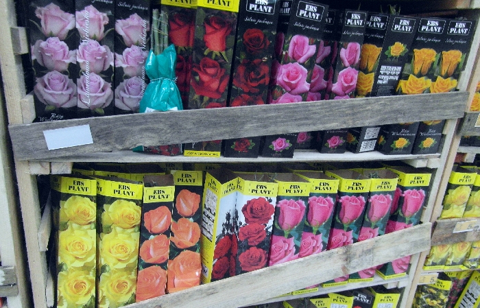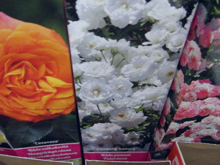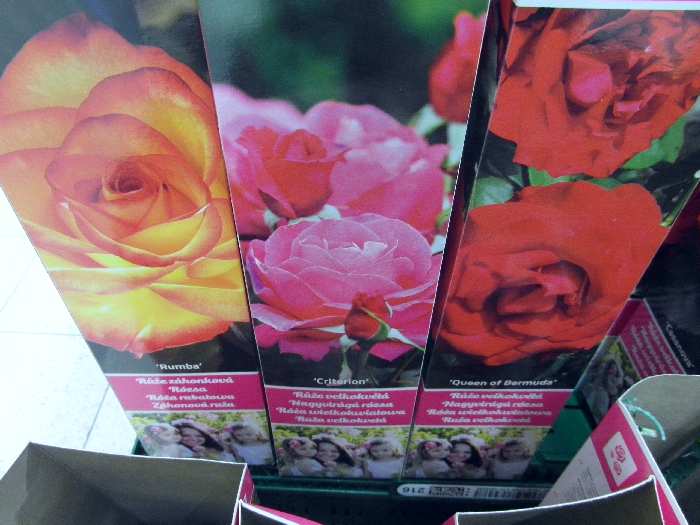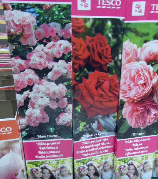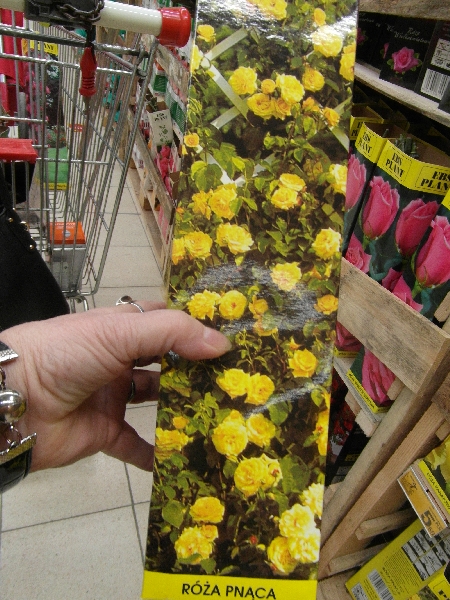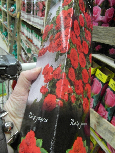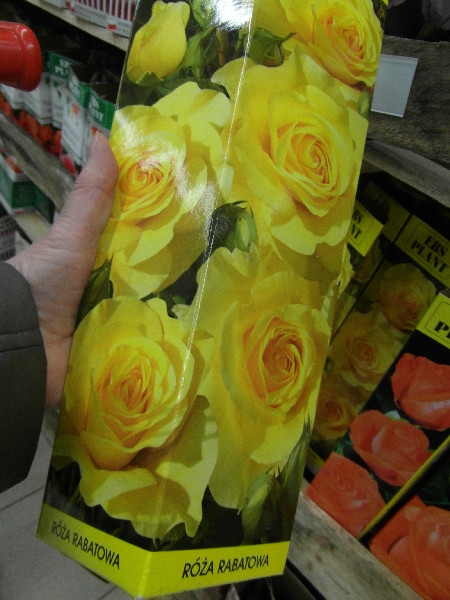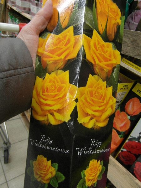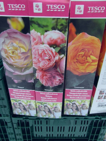 Nie dotarłam dzisiaj do B1- za to szybkie zakupy w Tesco. Pognałam na dział ogrodniczy a tam zonk... Zadnych roslin Potem , w głębi marketu się okazało, kartoniki z różami stoją blisko działu owocowo warzywnego. Fotki zrobione, oto co jest. :fotka