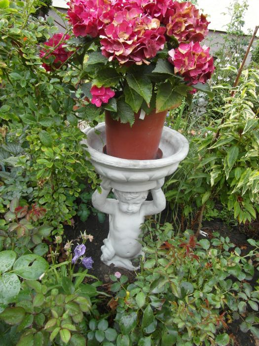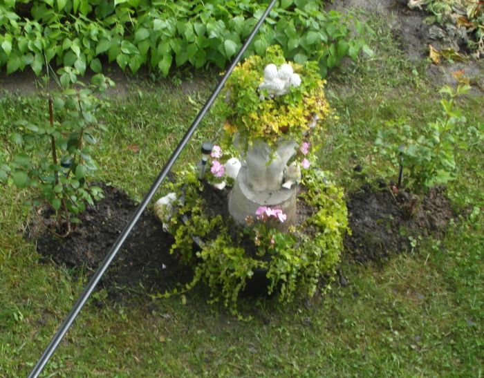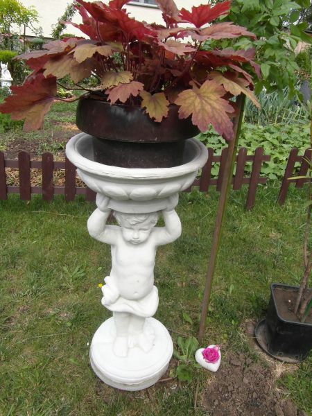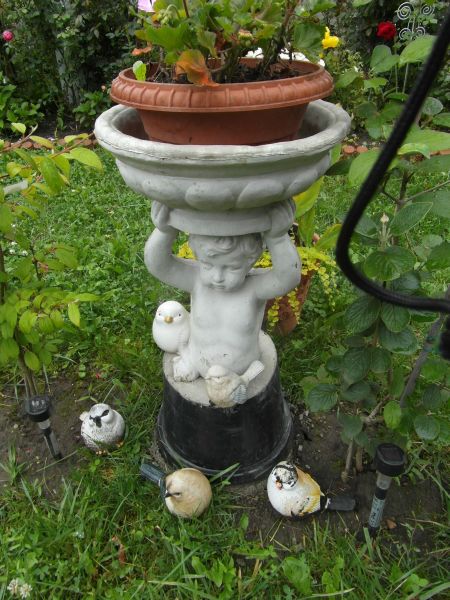 Nie pamiętam czy tu pisałam o zeszłorocznym zakupie figurki z donicą- kupiłam i za chwilę gdy mi przywieziona, przy przestawianiu- odpadła podstawa... :ohmy: No to był szok. Jako,że kupiłam niedaleko od mojego domu to zadzwoniłam z reklamacją i przywieziono mi drugą/ za dwa- trzy dni- już dokładnie nie pamietam. Poprzednią mi zostawiono,bo powiedziałam, że wkopie na rabacie i nie będą miec klopotu z zabieraniem z powrotem... Stała wkopana od zeszłego roku- aż przypadkiem będąc w Castoramie z mężem zobaczyłam w niedużych workach gotowy beton - taka gotowa mieszanka szybkoschnąca. Kupiliśmy i ja wykopałam tę figurke, wymyłam i po obeschnieciu/ pod zadaszeniem- zalał mąż betonem- uciął dno donicy i to była forma wink-3 . teraz po kilku dniach trzeba zdjąc donice/ rozciąć- pomalawać figurke i dokleić "romantycznie" ptaszki- i będzie następna stojaca figurka. :jupi