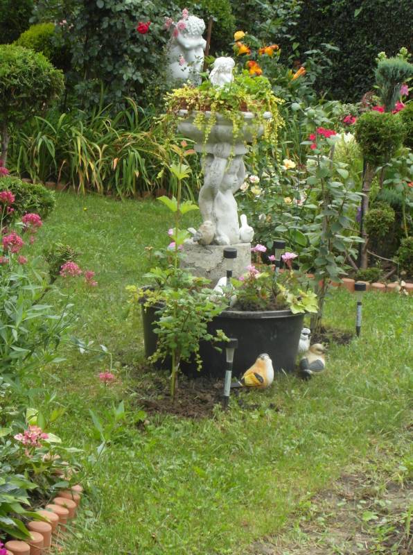 Jestem w trakcie tworzenia "zielonej fontanny" ;) Wykorzystuję to co mam na ogrodzie... Kastra pękła na dnie- poprosiłam zięcia o odcięcie dna, wkopałam , na dno kamienie, piasek , ziemia, plastikowy pojemnik , na to figura naprawiona, dosypałam bokami ziemi, ubiłam i wsadziłam rośliny- głównie tojeść rozesłaną / zwisając imituje wodę ;) /, kilka pelargonii- jeszcze przy okazji kupię kilka małych begonii -babek... Posadziłam wszystko zanim pomalowałam całość na biało- ale co chwila leje więc malowanie odpada a pogoda idealna na przyjęcie się roślin- to wsadziłam. Pomaluję jak poprawi się pogoda / kiedyś musi ;) /. Tak to na dzień dzisiejszy wygląda- na trzeciej fotce dosadzone więcej tojeści... wink-3 :fotka Cała ta fontanna- od ziemi do czubka będzie biała...