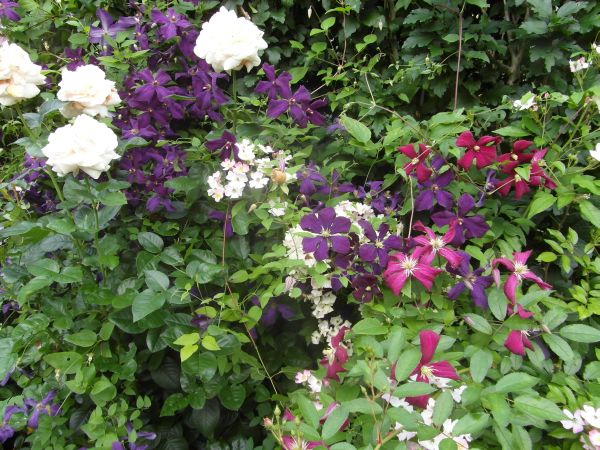 Tak sie rozrosły malutkie sadzonki clematisów z Biedronki- sprzed 3 lat... I tak polowę wycięłam, bo zbytnio mi zwisała. Bardzo sie rozrastają. bardzo... Przed nimi róza Aphrodite- ale światło było chyba niedobre, bo nie wyszły na fotce wyraźnie...