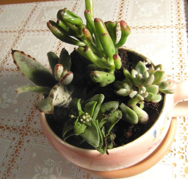 Sukulenciki w doniczce- ten na dole z lewej strony to ma chyba pączki- tak to przynajmniej wygląda...