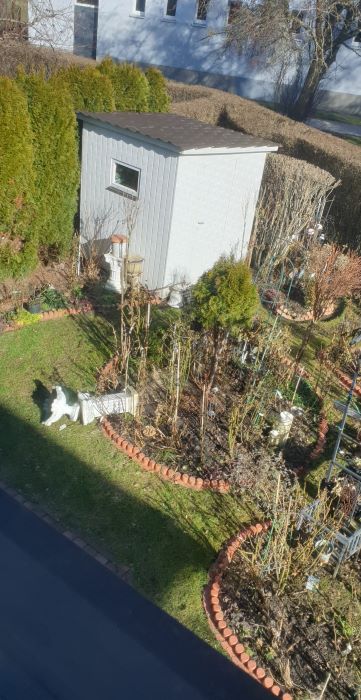 Tego..ten... Taki widok zobaczyłam za oknem- / nie byłam jeszcze na obchodzie ogrodu- śniegi dopiero zeszły, potem kilka dni deszczu- nie mogę łazić, bo mokro i błotnisto- narobię gumowcami bałaganu / . Kotka podeszła i zaprowadziła do okna na którym posiaduje- i właściwie pokazała co za oknem- a tam przewrócone kolumny i rozbite donice... Nie wiem dlaczego bo przecież stały cały sezon i zimę i nic... Poczekam aż podeschnie i pójdę porządkować.