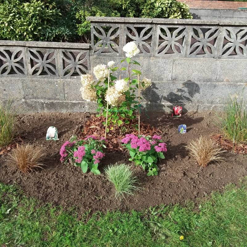 Witajcie Kochani. Ja tylko na sekundke. Było akurat kilka promykow słonca więc zrobiłam fotki z postepow na mojej rabatce. To jeszcze nie koniec oczywiscie. Co rusz coś przesadzam, przesuwam. Jak widzicie musiałam ją trochę powiekrzyc i uszczknac jeszcze trochę trawnika. Niestety jezowek już nie było także puste miejsca wypelniam cebulkami w koszyczkach żeby łatwo potem było wykopac. W przyszlym roku dosadze jeżówki i na razie nie wiem co jeszcze. Zobaczymy.