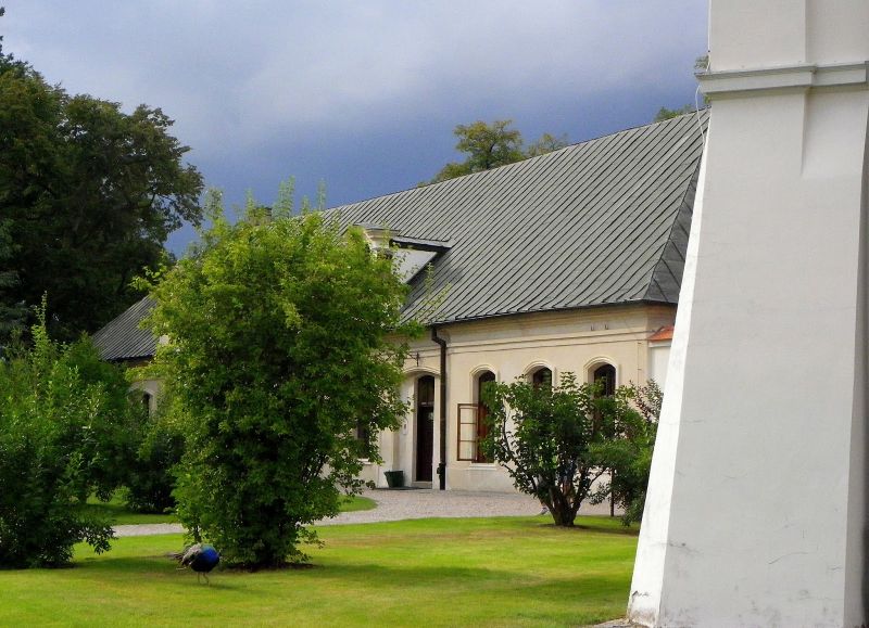 Cały teren, wraz z barokowym założeniem parkowo-ogrodowym , z rosarium i przyległymi budynkami , jest zadbany i z pietyzmem pomyślano o najdrobniejszych elementach , które mogłyby oddać klimat minionych czasów; w wolierach parkowych, w bażanciarni, możemy podziwiać jaskrawo kolorowe bażanty, zaś po olbrzymim dziedzińcu przechadza się dumie paw , pokrzykując swoim zachrypniętym , donośnym głosem, na turystów zakłócających mu spokój swoją obecnością. Bramę wjazdową zdobi herb Zamoyskich - Jelita - ze słowami , które podobno wypowiedział do , Władysława Łokietka po bitwie pod Płowcami , protoplasta herbowy Florian Szaryusz ( Szary) "To mniey boli.." .