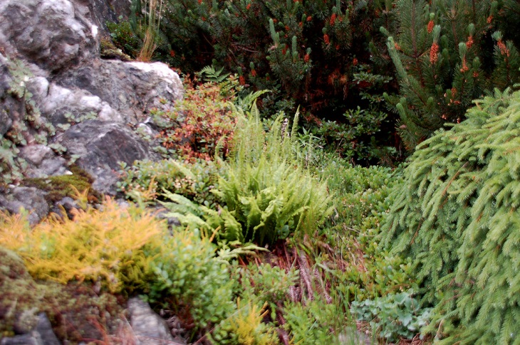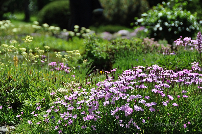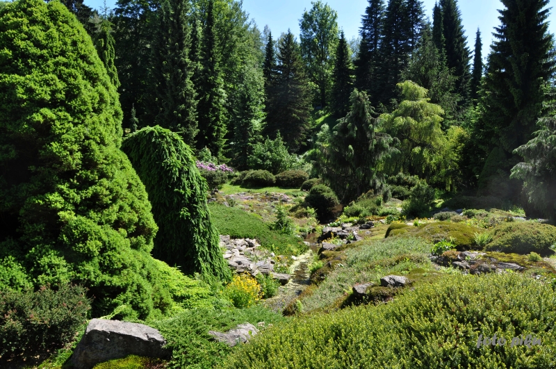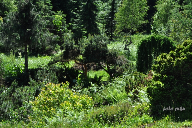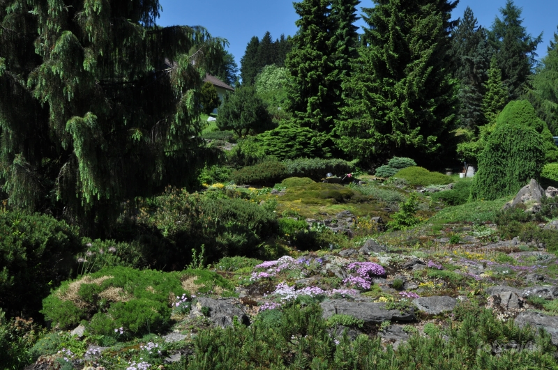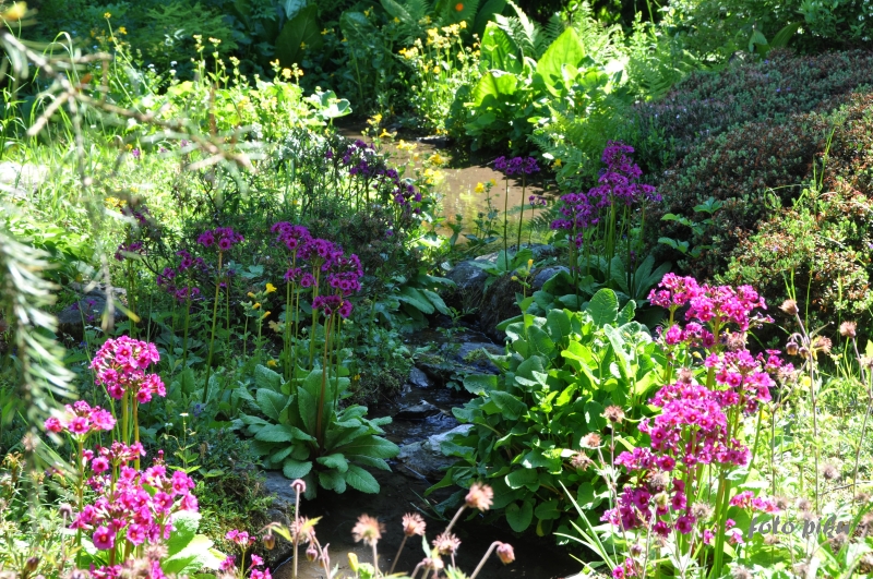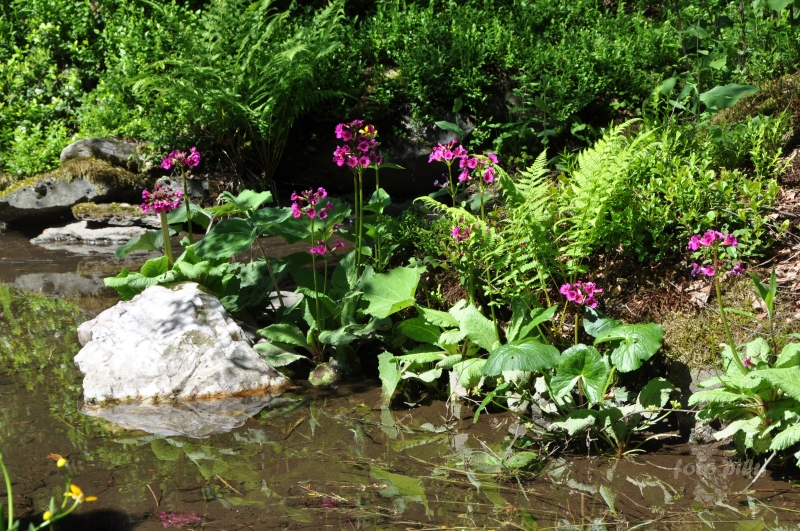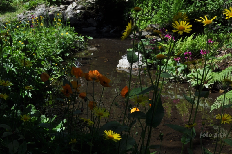 W sumie, relację zaczęłam od końca, bo wzniesiona część alpejska z ostrą skałą na szczycie , to korona tego ogrodu. Wcześniej jednak, idąc od domu pani Marii, mijamy część nadwodną, połozoną przy stawie i górskim potoku. Możemy tu podziwiać rośliny wodne, bagienne, ale i cienioluby . Nad potokiem zadziwia feeria barw kolorowych , płożących dywanów, utworzonych z roślin skalnych.