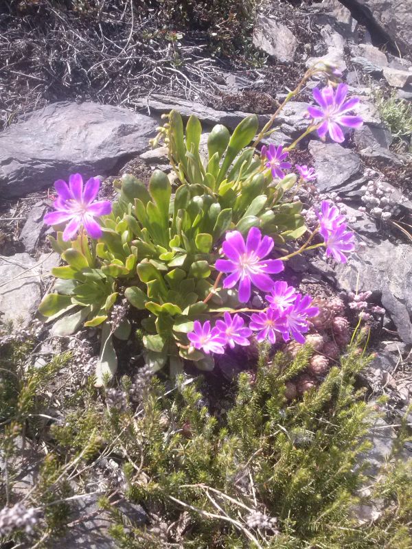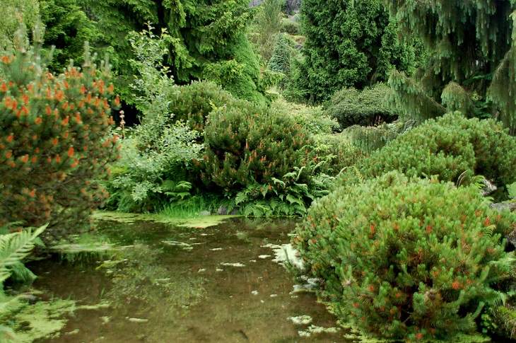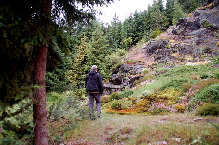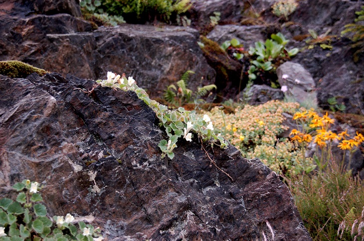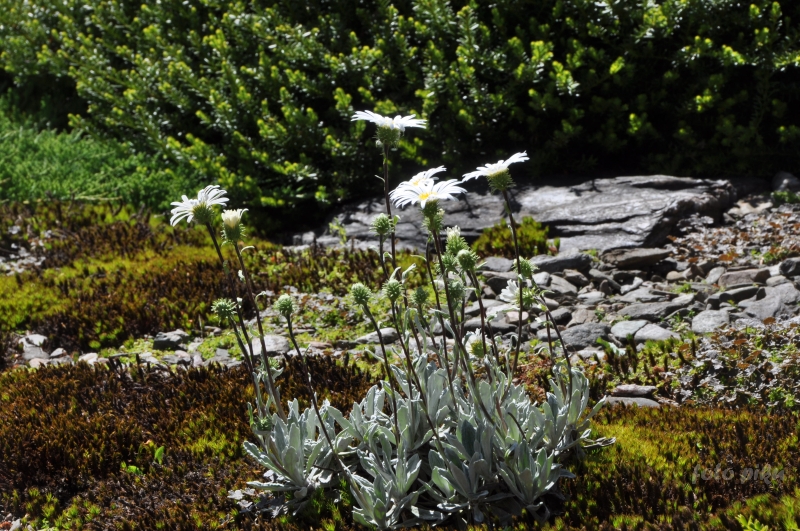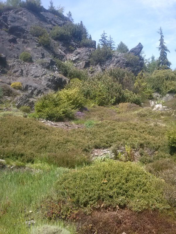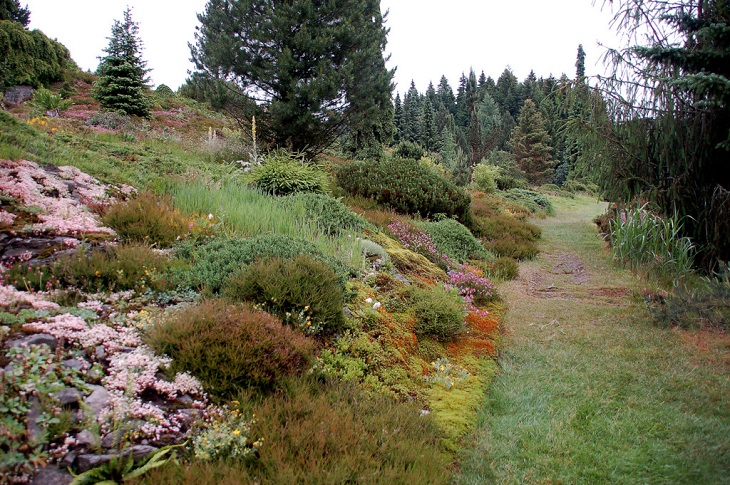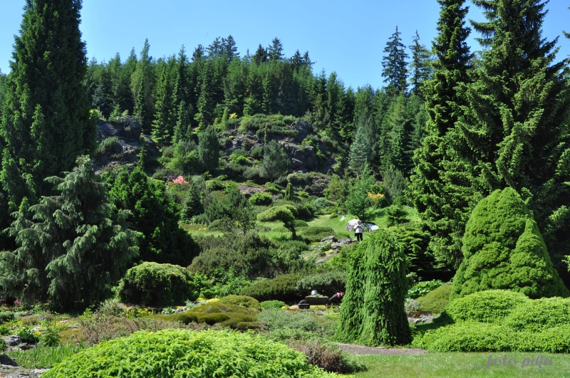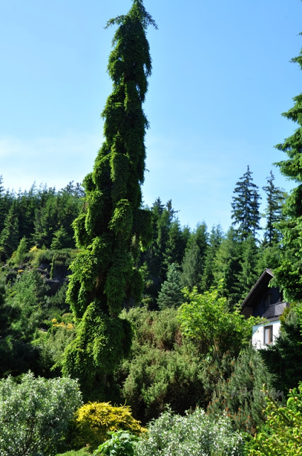 W sumie, relację zaczęłam od końca, bo wzniesiona część alpejska z ostrą skałą na szczycie , to korona tego ogrodu. Wcześniej jednak, idąc od domu pani Marii, mijamy część nadwodną, połozoną przy stawie i górskim potoku. Możemy tu podziwiać rośliny wodne, bagienne, ale i cienioluby . Nad potokiem zadziwia feeria barw kolorowych , płożących dywanów, utworzonych z roślin skalnych.