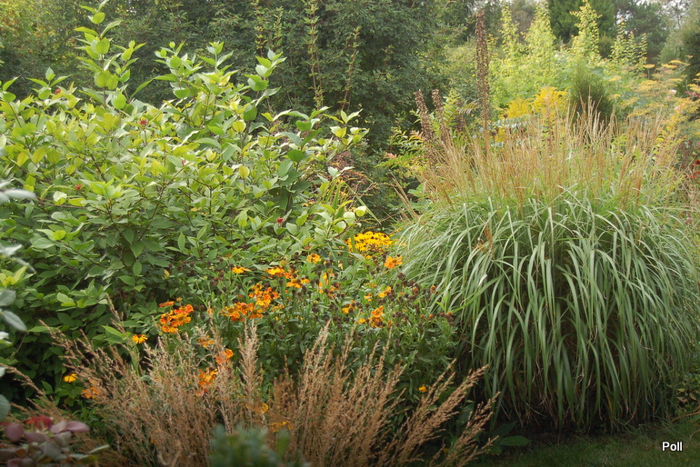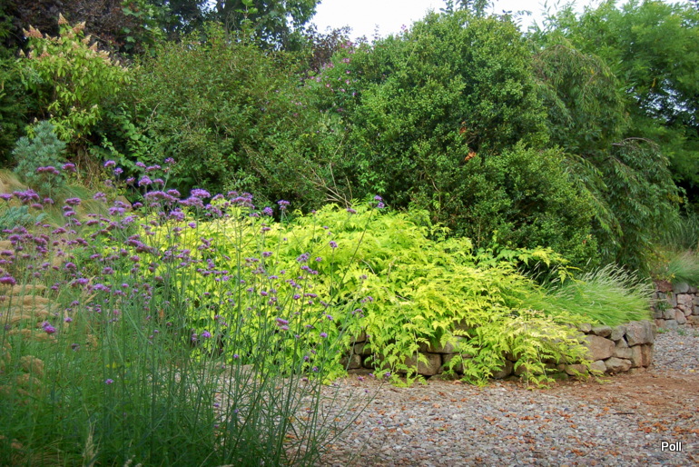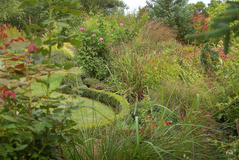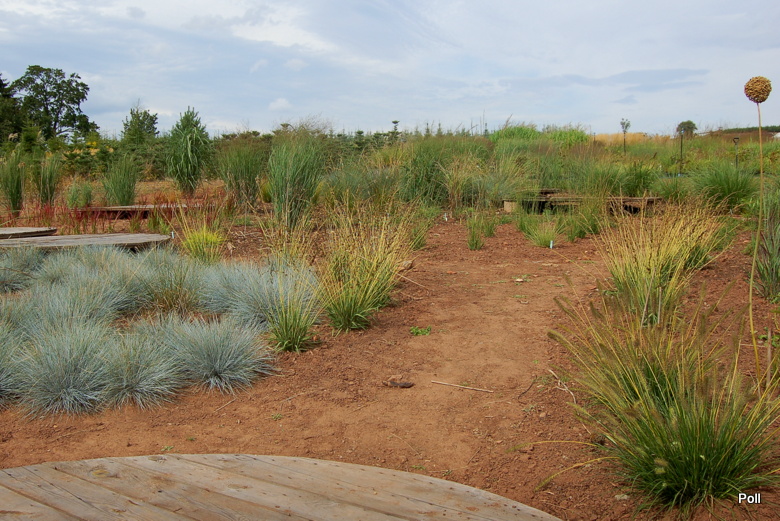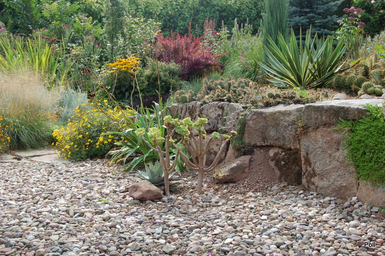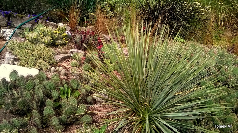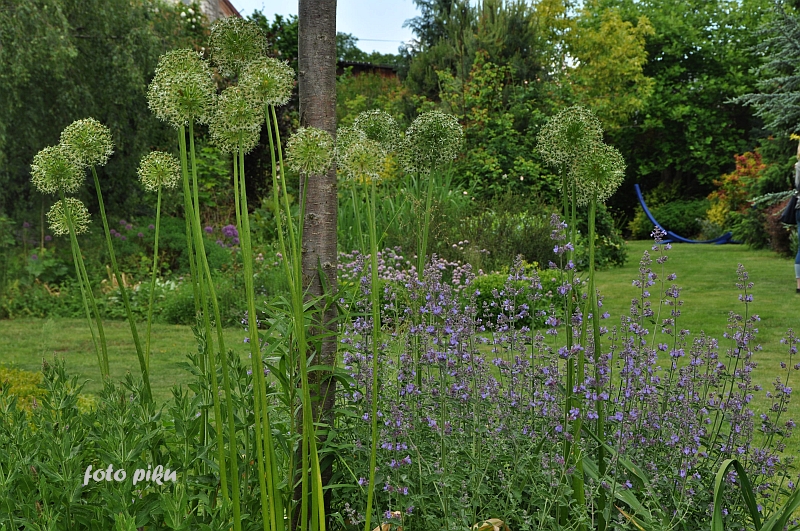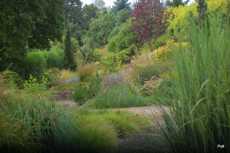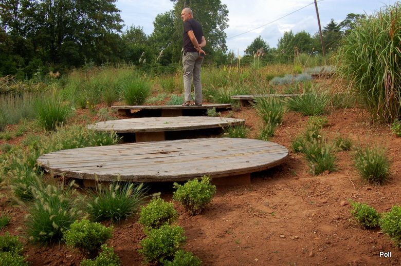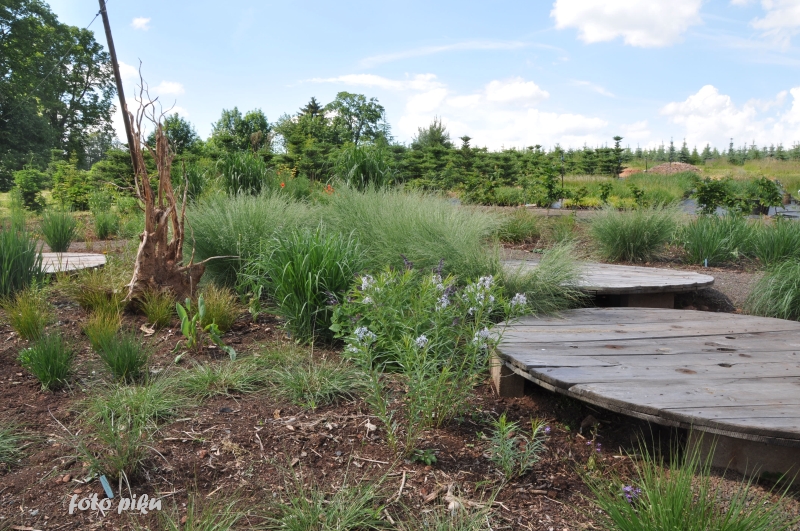 Ostatnio powstałym miejscem jest położona na słonecznym stoku rabata trawiasta, której nieco kosmicznego charakteru nadają podesty-ścieżki o kształcie koło. Był to kapitalny pomysł i gdy rośliny się rozrosną, będzie to jedna z najpiękniejszych rabat trawiastych, jakie widziałam. Wielkim plusem i ułatwieniem, jest brak konieczności skupienia się na ograniczonym terenie, bo miejsca jest jeszcze sporo , więc można to i owo dodać.