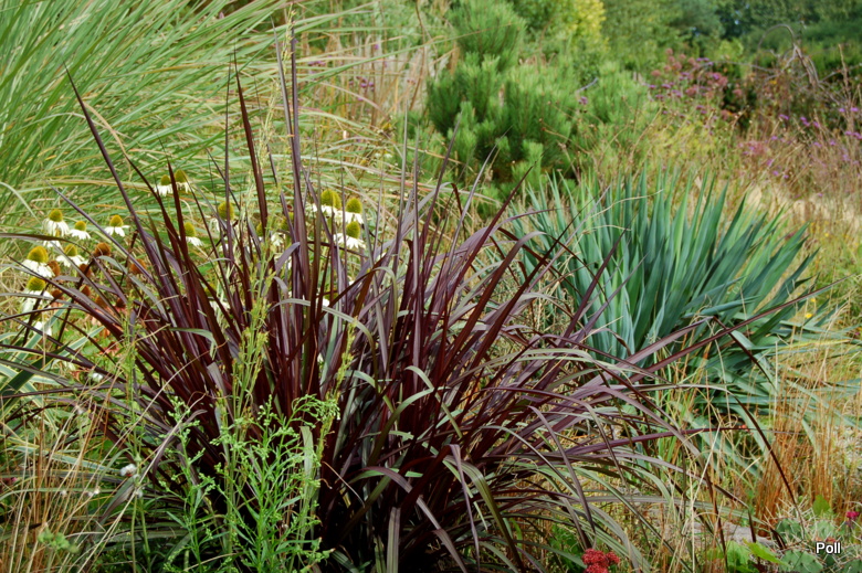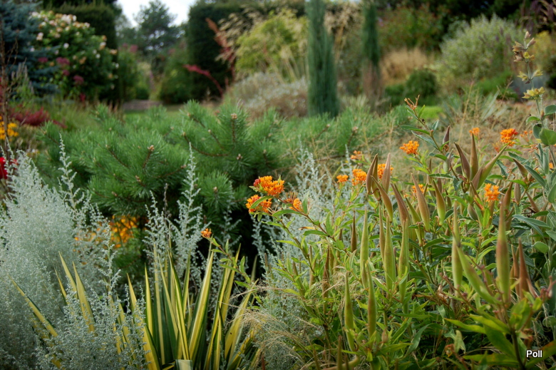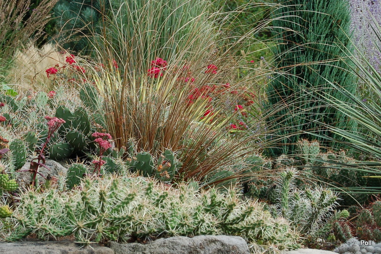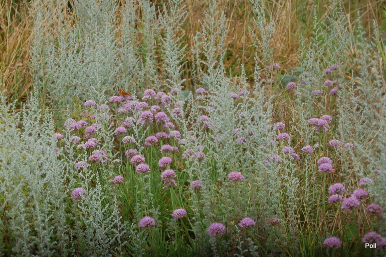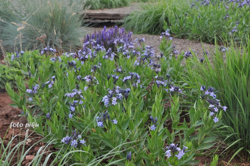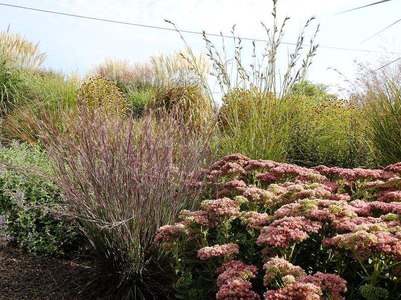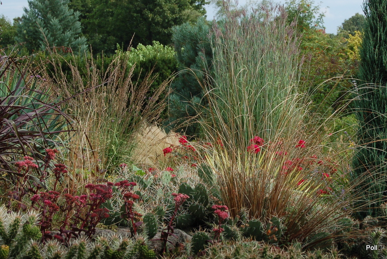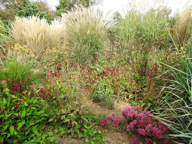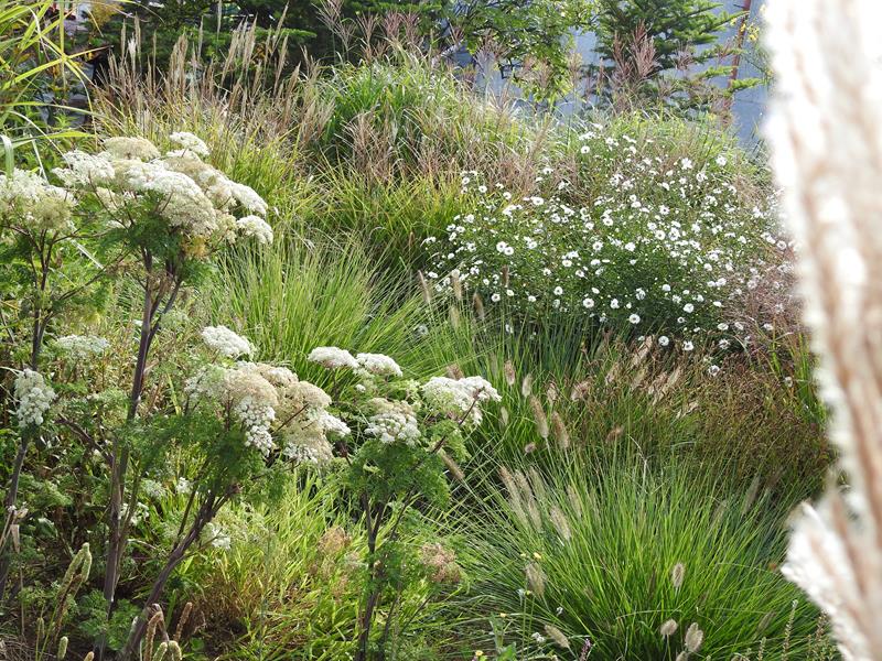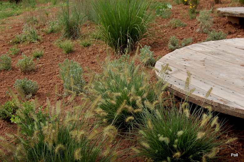Ostatnio powstałym miejscem jest położona na słonecznym stoku rabata trawiasta, której nieco kosmicznego charakteru nadają podesty-ścieżki o kształcie koło. Był to kapitalny pomysł i gdy rośliny się rozrosną, będzie to jedna z najpiękniejszych rabat trawiastych, jakie widziałam. Wielkim plusem i ułatwieniem, jest brak konieczności skupienia się na ograniczonym terenie, bo miejsca jest jeszcze sporo , więc można to i owo dodać.