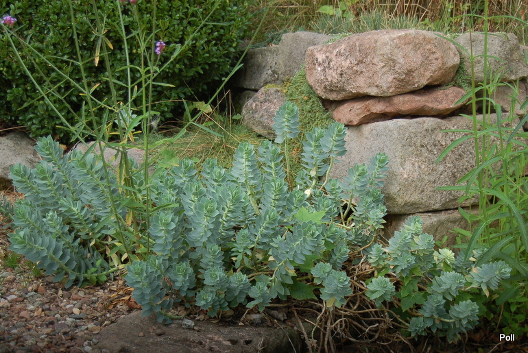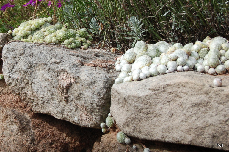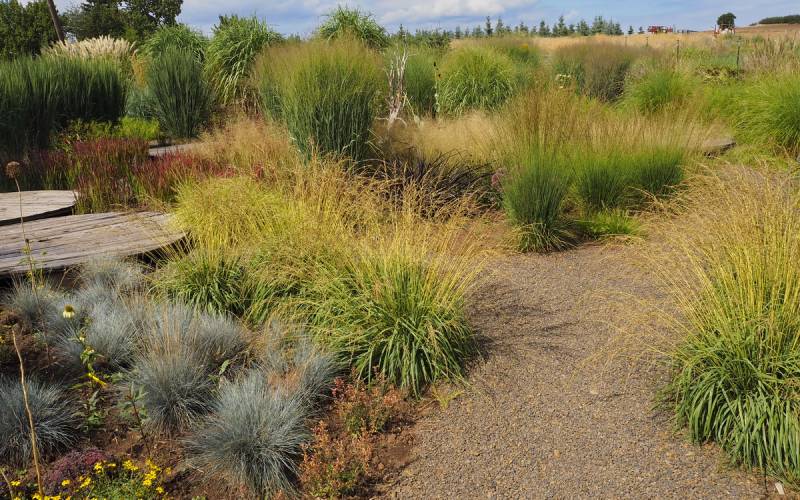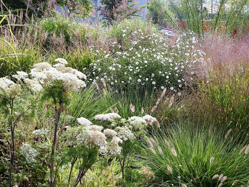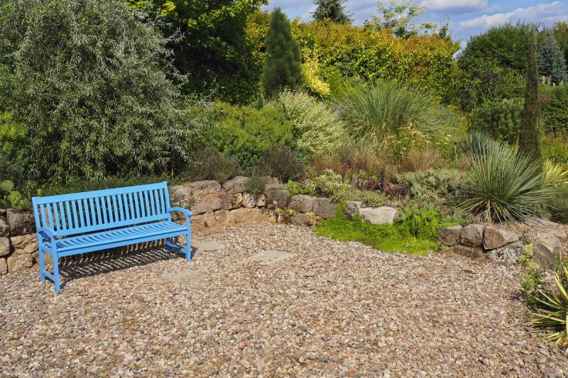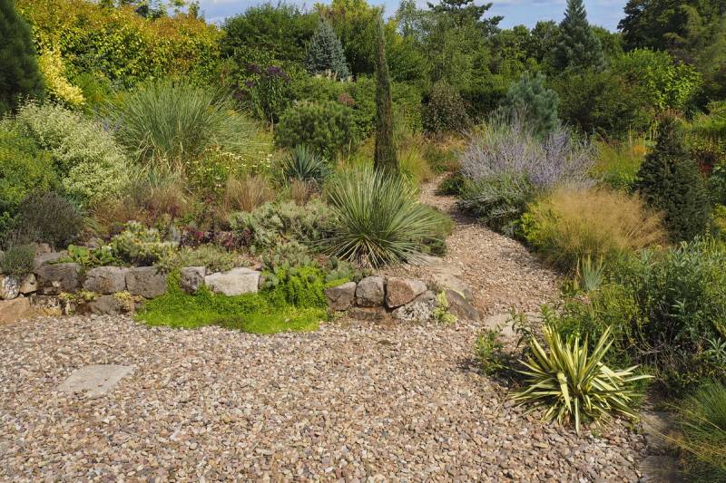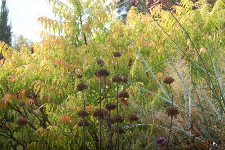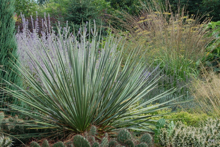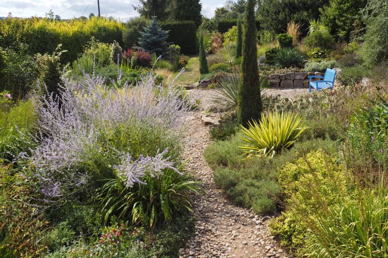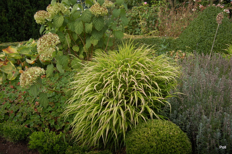 Ostatnio powstałym miejscem jest położona na słonecznym stoku rabata trawiasta, której nieco kosmicznego charakteru nadają podesty-ścieżki o kształcie koło. Był to kapitalny pomysł i gdy rośliny się rozrosną, będzie to jedna z najpiękniejszych rabat trawiastych, jakie widziałam. Wielkim plusem i ułatwieniem, jest brak konieczności skupienia się na ograniczonym terenie, bo miejsca jest jeszcze sporo , więc można to i owo dodać.