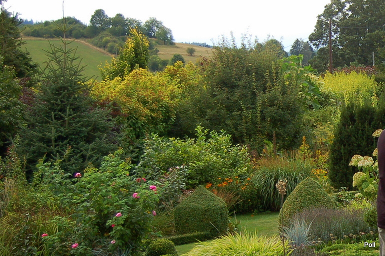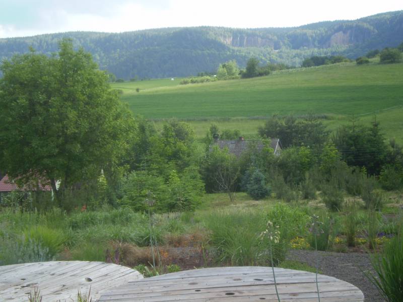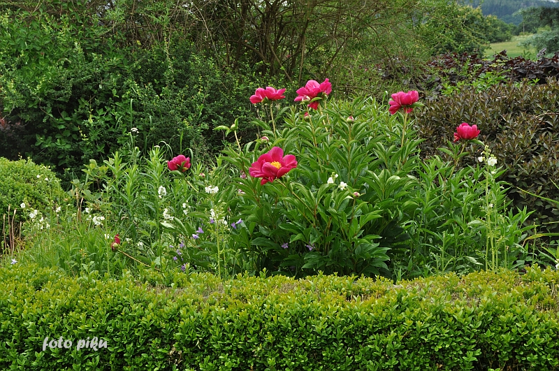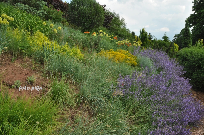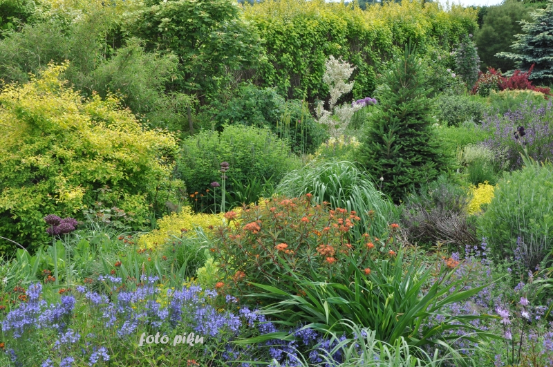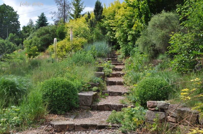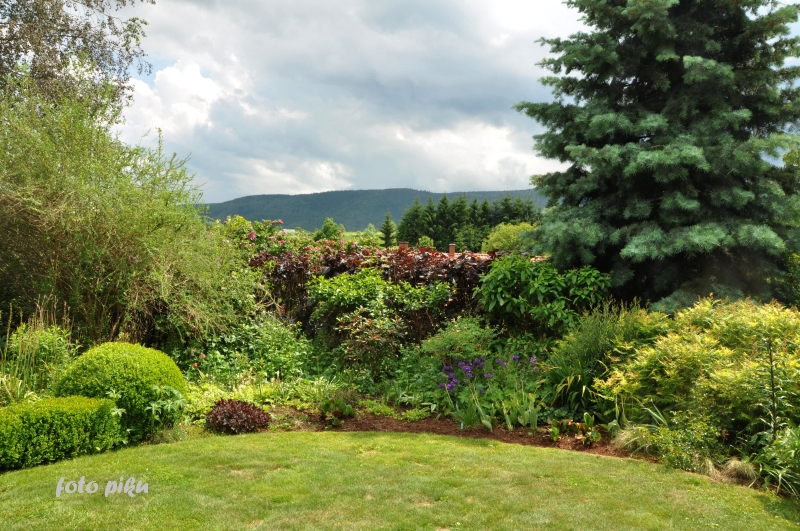 Wspaniale położony na stoku, z cudnym widokiem na majaczący w oddali Szczeliniec , ma tę przewagę nad innymi ogrodami, że teren 'współpracując z Kasią i Tomkiem, pozwolił na stworzenie niebanalnego miejsca. Jednoczesśnie, nie jest to teren łatwy, więc kształt ogrodu i poszczególnych pokoi, wymuszony jest niejako przez górskie warunki. Nie chciałabym też, aby ktoś pomyślał, iż jest to założenie na miarę Wojsławic.... Tak nie jest, bo ogród w Radkowie jest ogrodem wiele mniejszym i kameralnym, ale jednak wartym odwiedzenia.